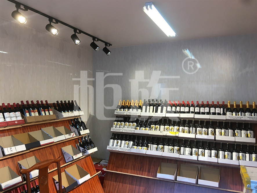 展柜外觀使用黑色噴漆,簡潔大氣。內(nèi)部平面裝修,搭配射燈,視覺明凈,可以很好地將顧客的注意力吸引至琳瑯滿目的紅酒產(chǎn)品上。