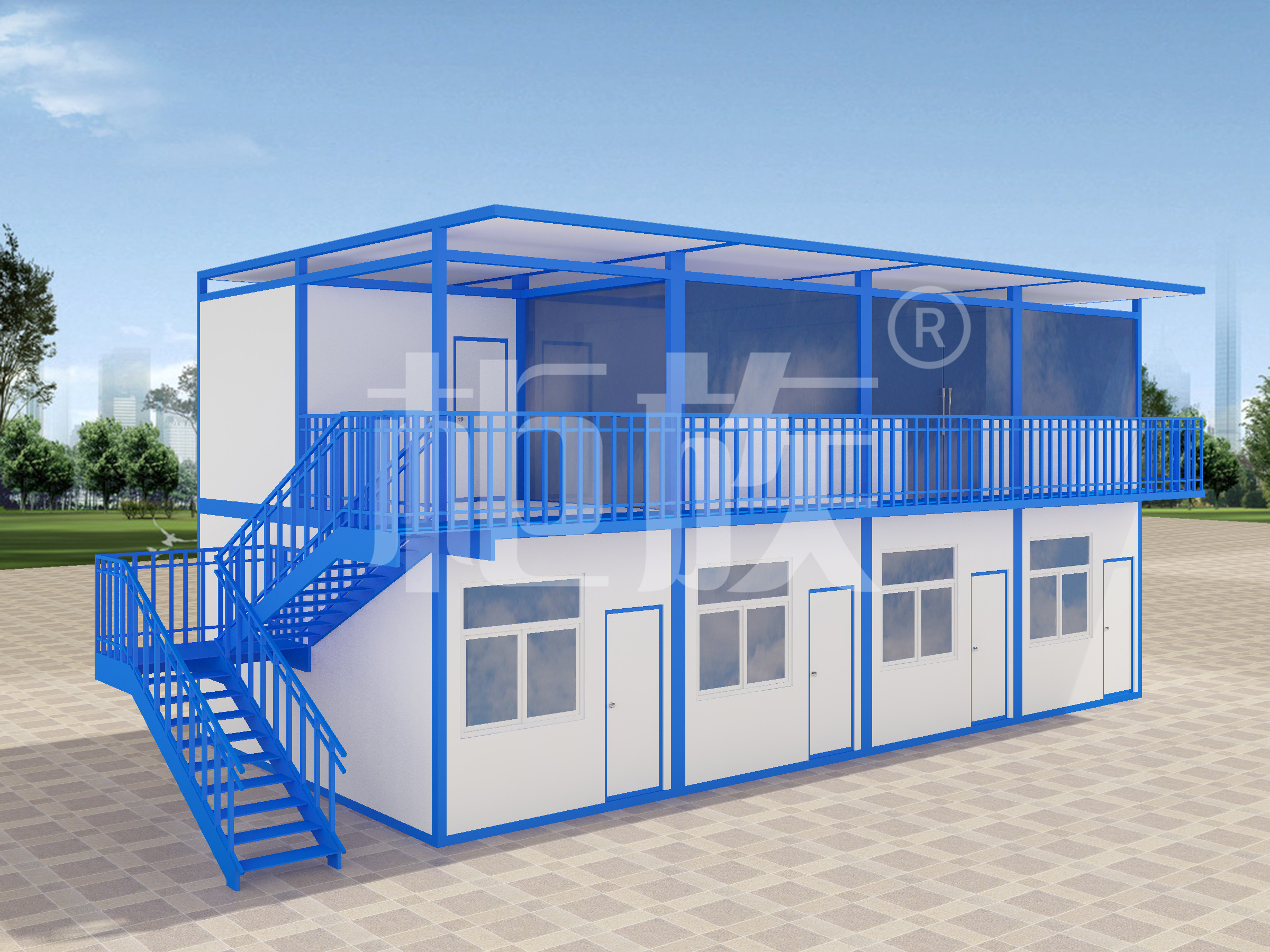 多個(gè)箱體拼接而成,藍(lán)白色的外觀簡(jiǎn)潔流暢。工廠生產(chǎn)、成品直接運(yùn)輸至使用場(chǎng)地,配套設(shè)施齊全,即到即用。