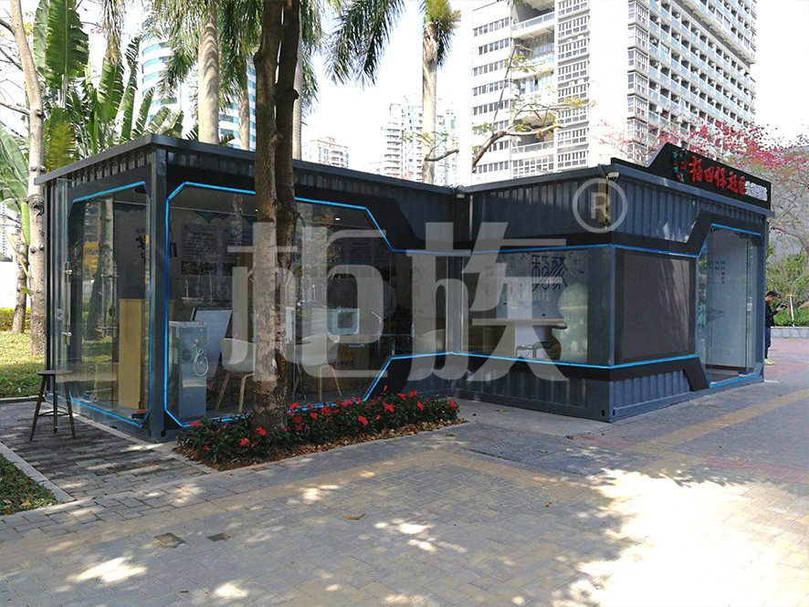 驛站使用兩個集裝箱錯位串聯(lián)而成,正面墻體使用大面積玻璃門窗,線條流暢、造型時尚、通透亮堂,很好的突出了驛站的標(biāo)志性與開放性的特點。